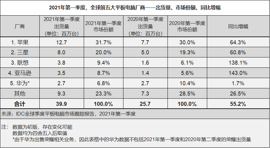 由于目前世界上大部分地区仍在应对“新冠疫情”,导致了平板电脑的销量依旧火爆。国际数据公司(IDC)全球平板电脑季度跟踪报告的初版数据显示,平板电脑市场在2021年第一季度表现出色,同比增长55.2%,出货量总计3,990......