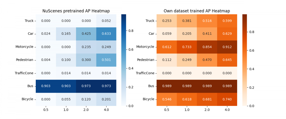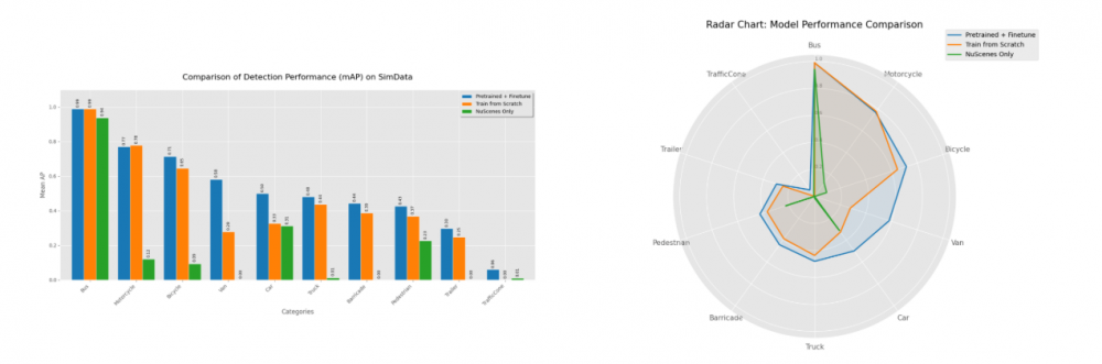 为了探究模型“学到了什么”,本文对比了“SimData训练模型”与“nuScenes官方预训练模型”在SimData测试集上的表现。