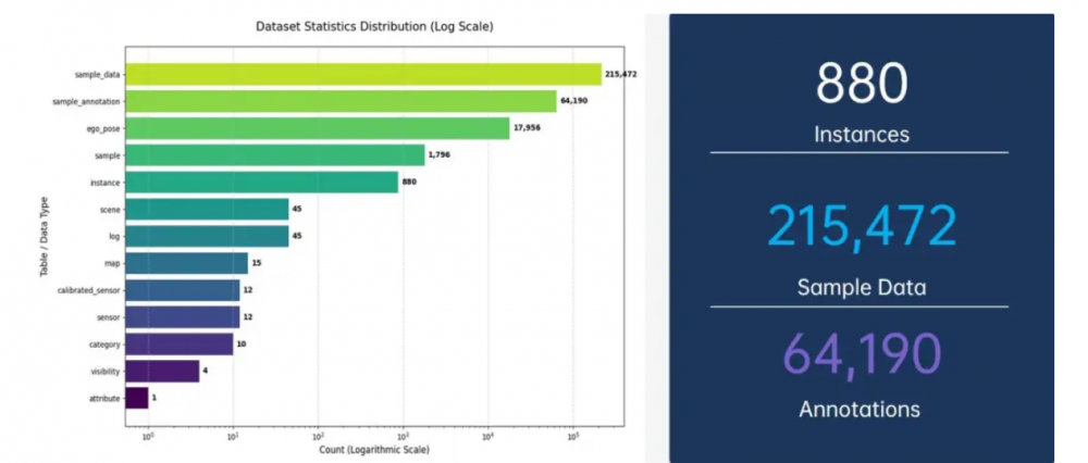 ①规模与密度: 数据集包含15张高精度地图和45个独立场景,单传感器数据量级突破18,000帧,总样本量(Samples)达到215,472帧,目标实例(Instances)超过64,000个;