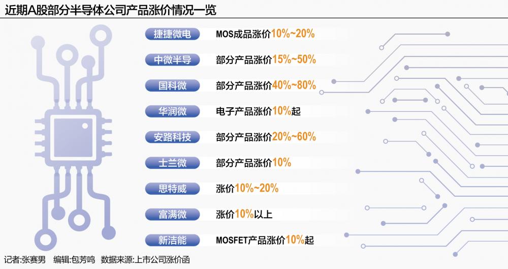 据21世纪经济报道记者统计,年初至今,士兰微(600460.SH)、思特威(688213.SH)、新洁能(605111.SH)、中微半导(688380.SH)、必易微(688045.SH)、国科微(300672.SZ)、美芯晟(688458.SH)、英集芯(688209.SH)、华润微(688396.SH)等A股公司均宣布提价。其中,中微半导发布的涨价通知函显示,部分产品涨价幅度15%~50%。国科微发的涨价函显示,1月起部分产品涨价80%。