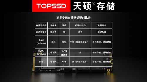 天硕(TOPSSD)长期深耕高可靠存储领域,深刻理解商业航天用户在“快速交付、成本可控、可靠性可验证”三个维度上的核心诉求。针对 LEO 遥感星座、卫星物联网与在轨 AI 计算平台等典型场景,公司将自研主控、固件算法与系统级加固能力深度融合,提供大容量、高速闪存的卫星专用存储器,让用户真正无需为在轨可靠性担忧。